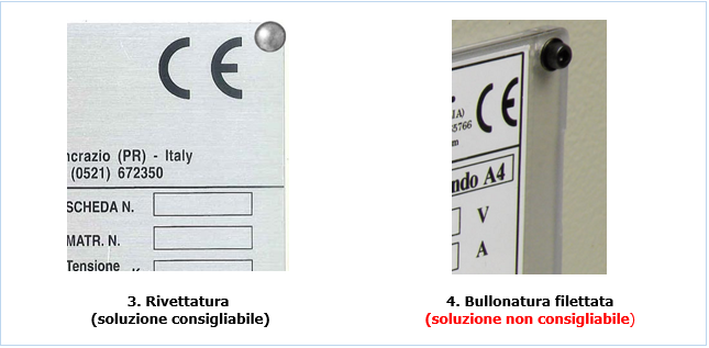 Il metodo di marcatura deve risultare permanente, così come il collegamento della piastra alla macchina, in particolare la guida ufficiale suggerisce la saldatura, rivettatura (3) o incollaggio, i giunti con bullonature passanti o bullonatore filettate (4) non sono da utilizzare in quanto potrebbero essere facilmente rimosse.