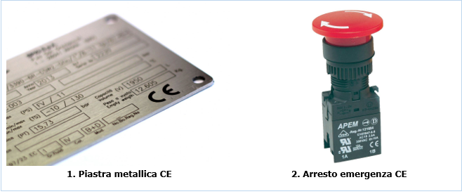 La marcatura CE è normalmente applicata su una macchina per mezzo di una piastra metallica (1), ma, ad esempio per i componenti di sicurezza che rientrano nel campo di applicazione della Direttiva Macchine (Allegato V), in genere la marcatura CE e le relative informazioni sono stampate (2) sullo stesso.