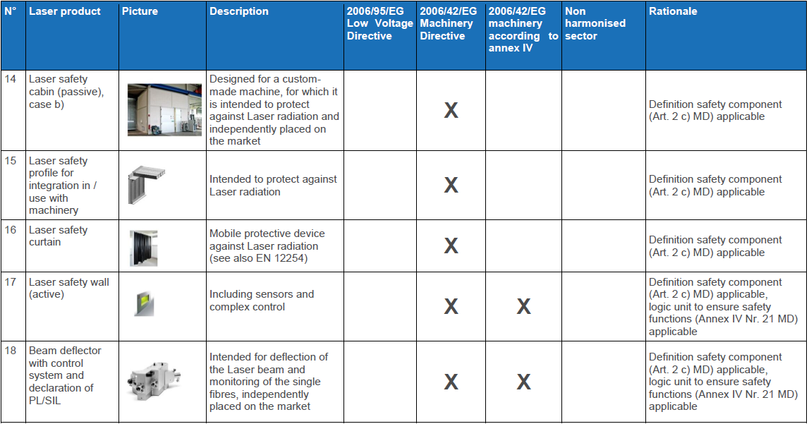 Lo scopo del presente documento è quello di fornire una panoramica delle direttive applicabili in termini di rilevanza per i prodotti laser tipi, il problema principale è di presentare quali prodotti sono soggetti alla Direttiva Macchine 2006/42/CE.