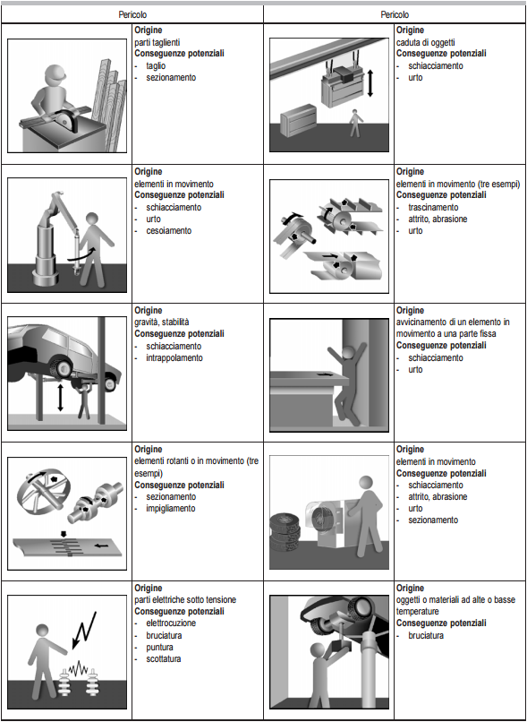 La appendice fornisce, in prospetti separati, esempi di pericoli, situazioni pericolose ed eventi pericolosi per chiarire questi concetti e per aiutare le persone che svolgono la valutazione del rischio nel processo di identificazione dei pericoli.
