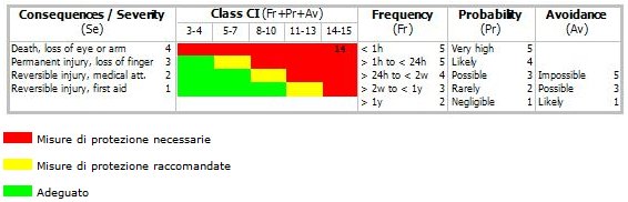 Il metodo ibrido per la stima del rischio in accordo con la norma ISO/TR 14121-2 A.7, prevede prima il calcolo della classe di rischio (CI) effettuato sommando i tre valori delle colonne Frequency (Fr), Probability (Pr), Avoidance (Av) ed inviduando il livello di rischio nella casella colorata incrociando il risultato CI con il valore della colonna Severity (Se).