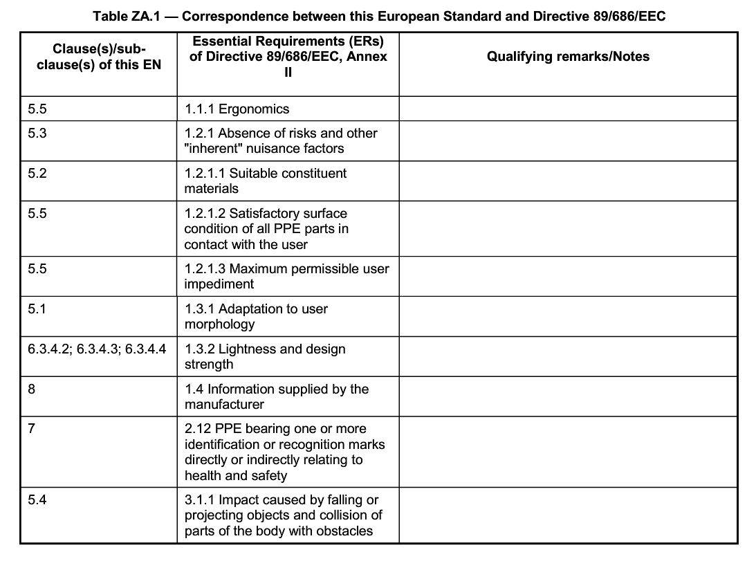 Come indicato nella tabella ZA.1 dell’allegato A della norma tecnica, la stessa permette di utilizzare il concetto di presunzione di conformità per molti dei RESS dell’All’II della Dir. 89/686/CE.