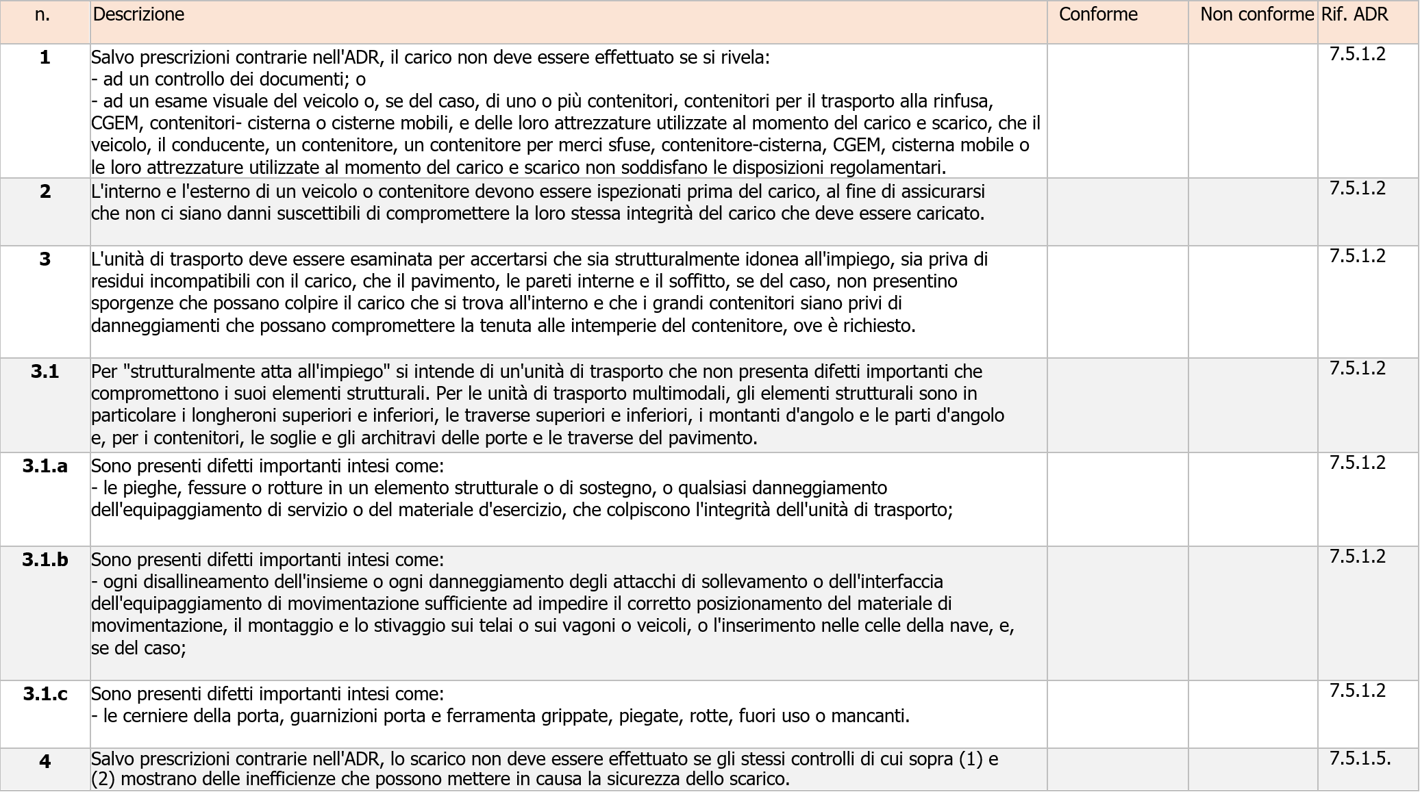 Il Documento allegato con relativa check list è inerente il carico, scarico e movimentazione di Merci pericolose ADR in riferimento al Capitolo 7.5 dell’ ADR 2023, e al punto B, una Check list di controllo:
