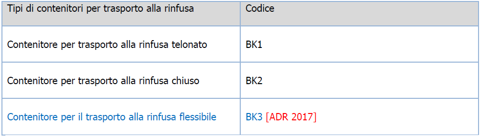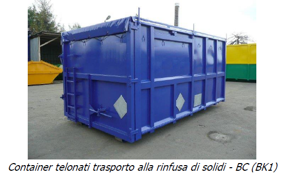 In ADR 6.11 sono riportate le prescrizioni costruttive e di controllo dei container telonati (BK1) o chiusi (BK2) per il trasporto alla rinfusa di solidi e dei contenitori per il trasporto alla rinfusa flessibile (BK3)* [*ADR 2017]