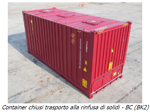 - contenitore per trasporto alla rinfusa chiuso, un contenitore per trasporto alla rinfusa completamente chiuso avente un tetto, delle pareti laterali, delle pareti anteriore e posteriore e pavimento rigidi (compresi i fondi di tipo a tramoggia). Questo termine comprende i contenitori alla rinfusa con tetto, pareti laterali o pareti anteriori e posteriori apribili che possono essere chiuse durante il trasporto. I contenitori per il trasporto alla rinfusa chiusi possono essere equipaggiati con aperture che permettono lo scambio dei vapori e dei gas con l'aria e di prevenire, nelle normali condizioni di trasporto, la perdita di materie solide e la penetrazione di getti d'acqua o di pioggia;