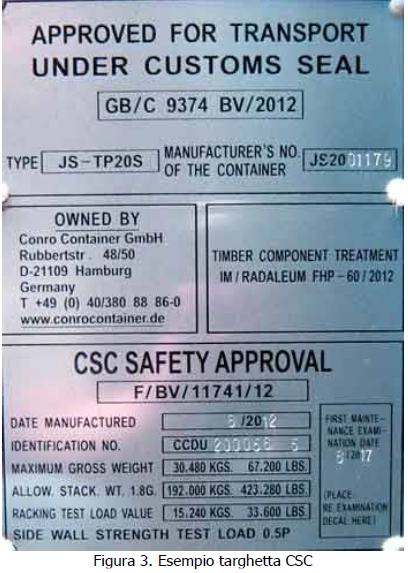La rispondenza alle norme CSC può essere attestata da un un'approvazione indicante che il container è stato sottoposto alle prove prescritte dalla citata convenzione internazionale e giudicato idoneo, per caratteristiche, resistenza, dimensioni, ecc., all'impiego nel trasporto intermodale ed alla movimentazione a carico a cui normalmente viene destinato.