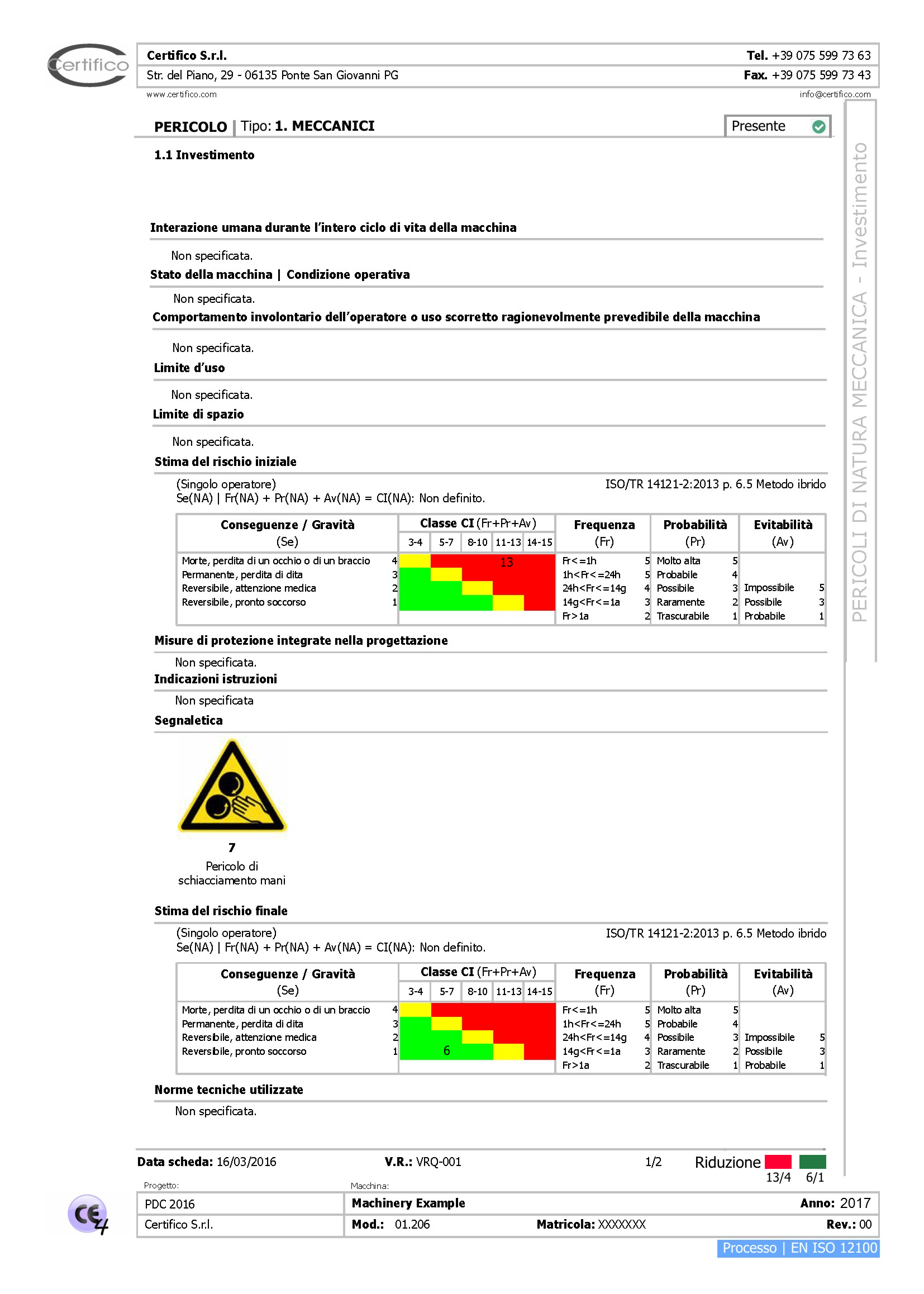 Dalla versione CEM4 Rel. 4.8.9 di Ottobre 2017 è modificato il Report di Valutazione del rischio RESS/Pericoli per l’inserimento del valore numerico/grafico della riduzione del rischio in riferimento alle matrici di stima del metodo ibrido ISO/TR 14121-2:2012 p. 6.5 (Fig. 1) confrontato tra la stima del rischio iniziale e finale/residuo (Fig. 2).
