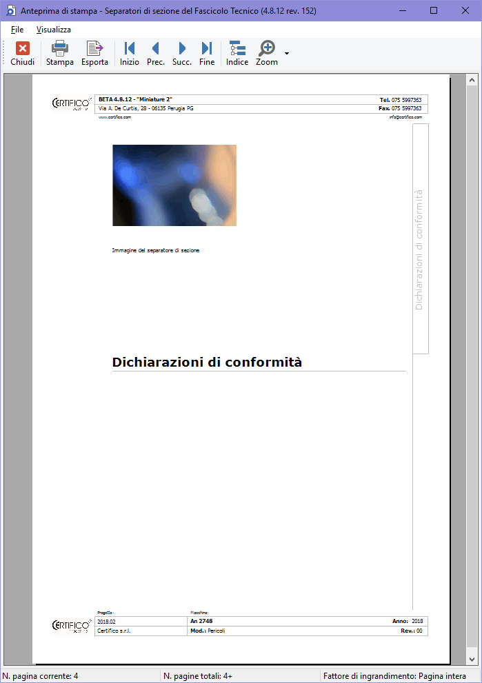 La nuova versione 4.8.12 di CEM4 consente di personalizzare con un'immagine i separatori di sezione, la copertina del Fascicolo Tecnico oppure la cover della nuova valutazione (per pericoli o per requisiti). L'immagine viene inserita all'interno del report e visualizzata nell'interfaccia del software.