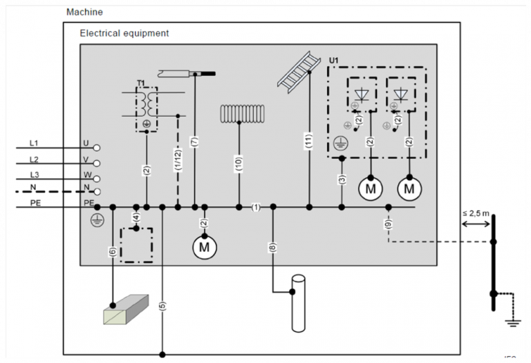 Da notare il collegamento indicato con il numero (9) che collega un conduttore limitrofo alla macchina necessario se esistono parti conduttrici distanti non più di 2,5 m dal circuito equipotenziale della macchina stessa e che sono suscettibili di introdurre un potenziale diverso dal potenziale dell’equipaggiamento elettrico (le cosiddette masse estranee).