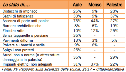 Una scuola su quattro ha una manutenzione inadeguata e solo il 3% è in ottimo stato. Un quarto circa di aule, bagni, palestre e corridoi presenta distacchi di intonaco; segni di fatiscenza, come muffe ed infiltrazioni, sono stati riscontrati nel 37% delle palestre, nel 30% delle aule, nel 28% dei corridoi, nel 24% dei bagni.