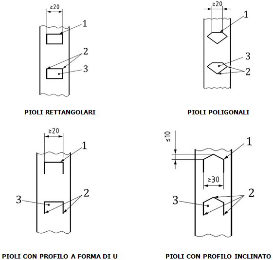 I pioli devono essere posizionati in modo che la loro superficie di appoggio del piede sia perpendicolare all’asse del montante. I pioli circolari non possono essere usati, la superficie calpestabile deve essere ≥ 20 mm.