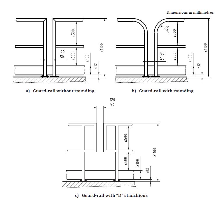 b. Cancelli di chiusura delle aperture nei parapetti (spazio sotto al corrente inferiore del cancello non superiore a 500 mm e non più 600 mm come in precedenza).