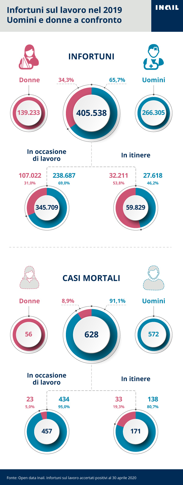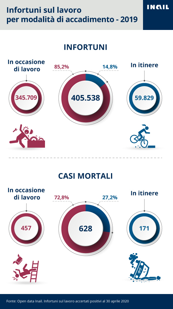 Gli infortuni sul lavoro denunciati all’Istituto nel 2019 sono stati 644.803, un numero sostanzialmente stabile rispetto al 2018 (-0,09%). Gli infortuni riconosciuti “sul lavoro” sono 405.538, di cui circa il 18,6% avvenuti “fuori dell’azienda” (cioè in occasione di lavoro “con mezzo di trasporto” e “in itinere”, nel percorso di andata e ritorno tra la casa e il luogo di lavoro).