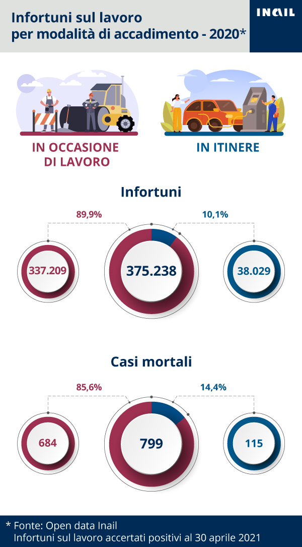 Gli infortuni accertati “sul lavoro” sono 799 (il 13,3% in più rispetto al 2019), di cui 261, circa il 32,67% “fuori dell’azienda” (93 casi sono ancora in istruttoria).