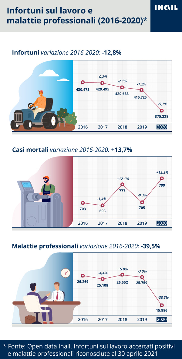 I dati sulle denunce di infortunio nel 2020 registrano, rispetto all’anno precedente, un calo dei casi in complesso e l’aumento significativo degli infortuni mortali.