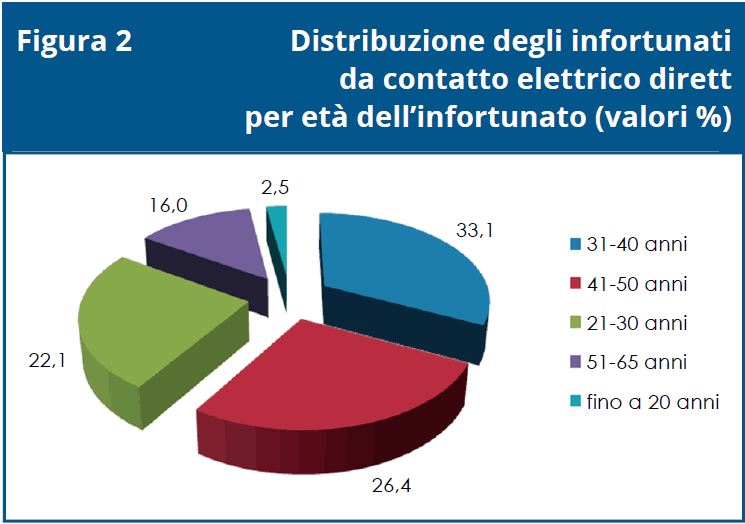 Infatti l’età media, nel caso dei contatti elettrici diretti, è stata generalmente più bassa, con una prevalenza della fascia 31 ÷ 40 anni e assenza di over 65, a fronte di un dato generale che ha visto prevalere la fascia 51 ÷ 65 (con un 29%) e oltre il 10% di infortunati over 65.