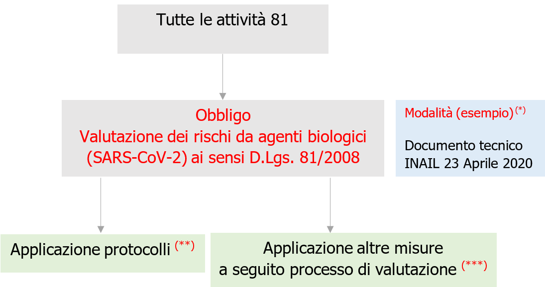 La specifica valutazione per il rischio da agenti biologici (COVID-19) è prevista dal titolo X. Una valutazione del rischio specifico per COVID-19 è obbligatoria per tutte le fattispecie in cui il rischio legato all’attività sia diverso da quello della popolazione generale (vedi anche Direttiva (UE) 2020/739 del 3 giugno 2020).