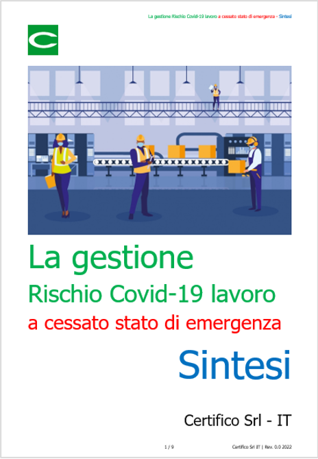 Nel Modello è analizzato il Rischio coronavirus nel luogo di lavoro ed integra il Documento di Valutazione del Rischio (Art. 17 e 28 del D.Lgs. 81/2008) a seguito della diffusione del coronavirus (COVID-19) nel territorio nazionale, per la parte luogo di lavoro secondo il Protocollo condiviso di regolazione delle misure per il contrasto e il contenimento della diffusione del virus Covid-19 negli ambienti di lavoro del 14 Marzo 2020, integrato dal Protocollo del 24.04.2020 così come modificato dal Protocollo del 06.04.2021 e specifici. Documento aggiornato al Decreto-Legge 24 marzo 2022 n. 24 che detta misure post cessazione dello stato di emergenza dal 1° Aprile 2022.