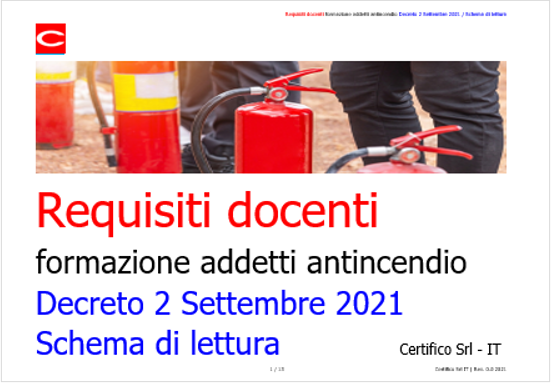 DM 2 settembre 2021 recante “Criteri per la gestione dei luoghi di lavoro in esercizio ed in emergenza e caratteristiche dello specifico servizio di prevenzione e protezione antincendio, ai sensi dell’articolo 46, comma 3, lettera a), punto 4 e lettera b) del decreto legislativo 9 aprile 2008, n. 81”. Ulteriori indicazioni procedurali per le attività di formazione e materiali didattici per i corsi di formazione per addetti antincendio.