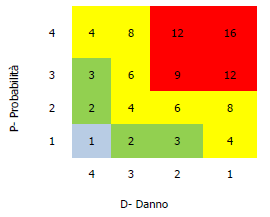 Definiti il danno e la probabilità, il rischio viene automaticamente determinato mediante la formula R = P x D ed è indicato nella tabella grafico/matriciale seguente, avente in ascisse la gravità del danno atteso ed in ordinate la probabilità del suo verificarsi.
