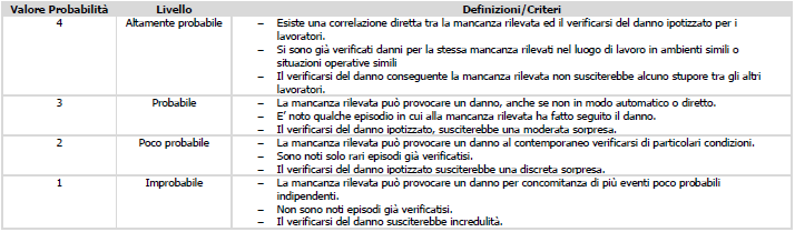 L’altro fattore che la “metodologia” utilizza, in abbinamento al “danno”, è la “probabilità” dell’evento dannoso, secondo la seguente scala (scala elaborata):