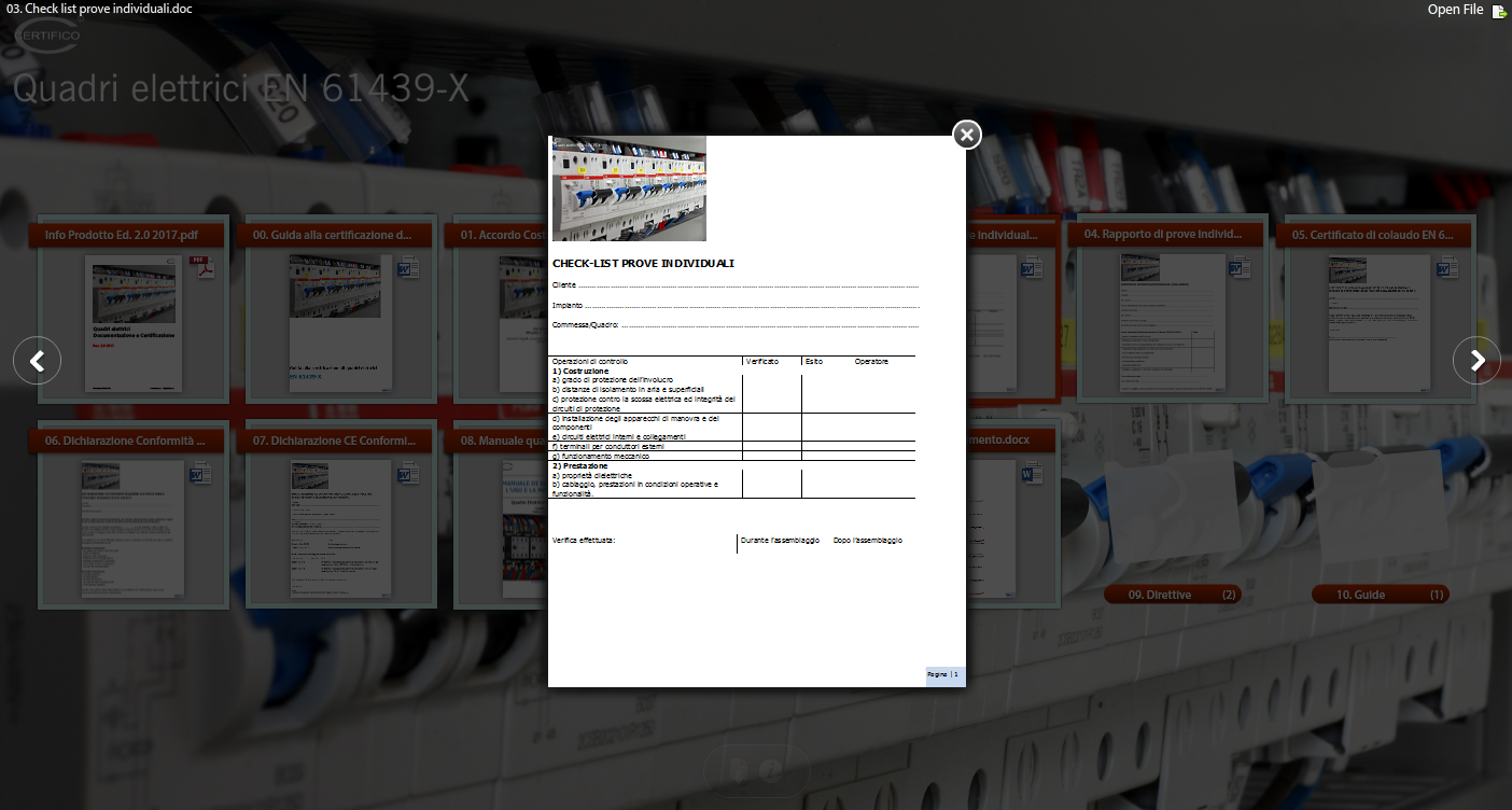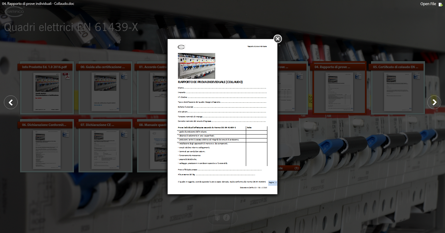 Un esempio di documentazione di collaudo, con riassunte le verifiche e prove previste e, per ognuna di esse, l’esito ottenuto, per un quadro conforme alle CEI EN IEC 61439, è riportata nel Prodotto.